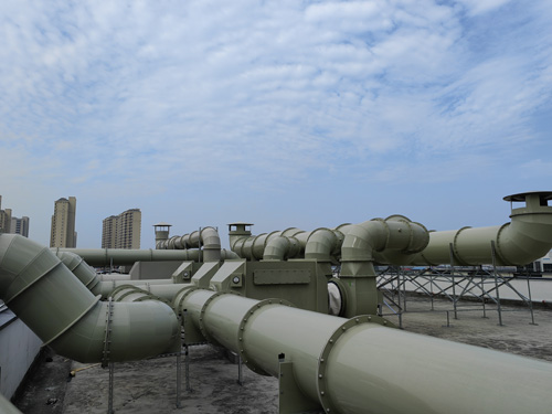 研究室廢氣的排放 → 催化活性炭濾水器濾水器 → 引軸流式風機 → 的排放